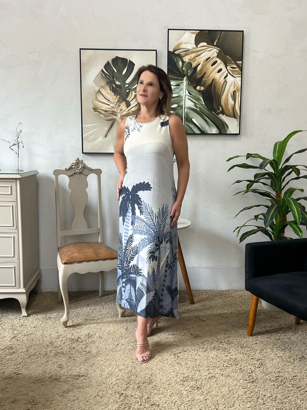 Vestido Leila Midi Estampado - Azul/Branco